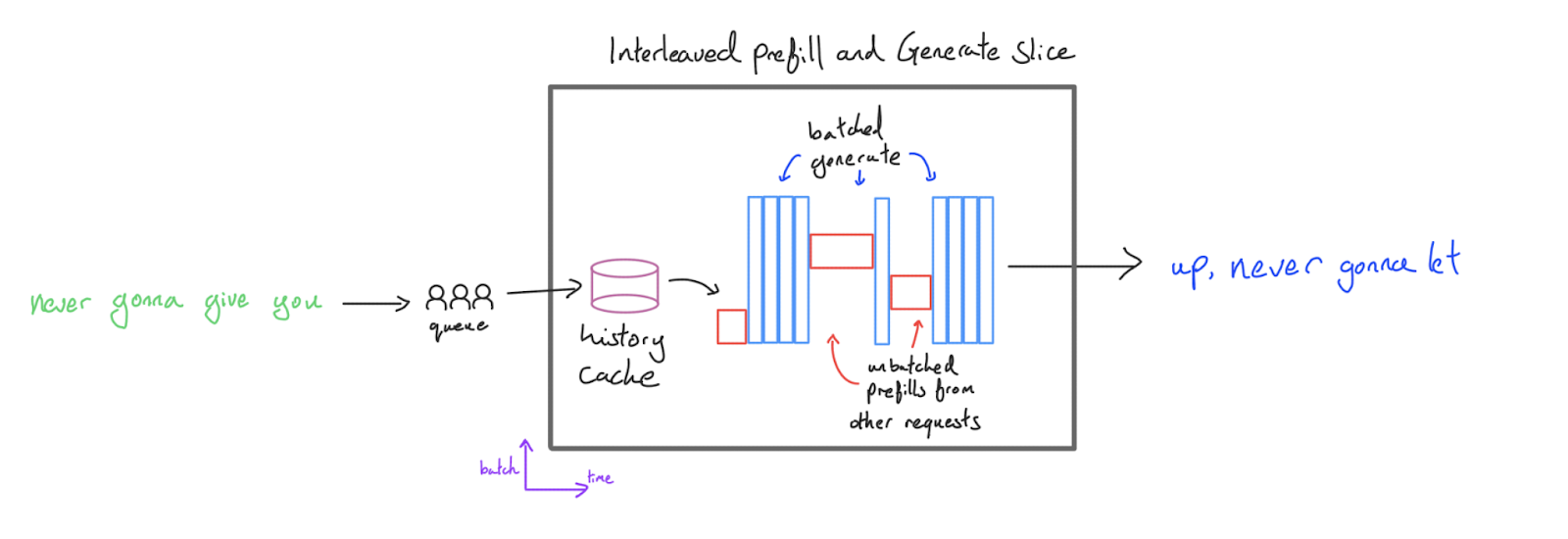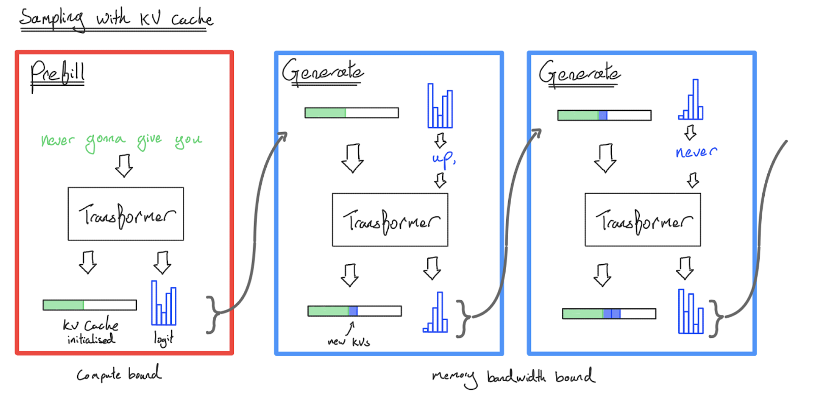 - 生成(Generation):给定一个 KV 缓存和之前的 logits,我们从 logits 中逐步采样一个 token,将该 token 反馈回 Transformer,并为下一步产生一组新的 logits。同时还需要将该新 token 的 KV activations 追加到 KV 缓存中。重复这个过程,直到遇到一个终止符(