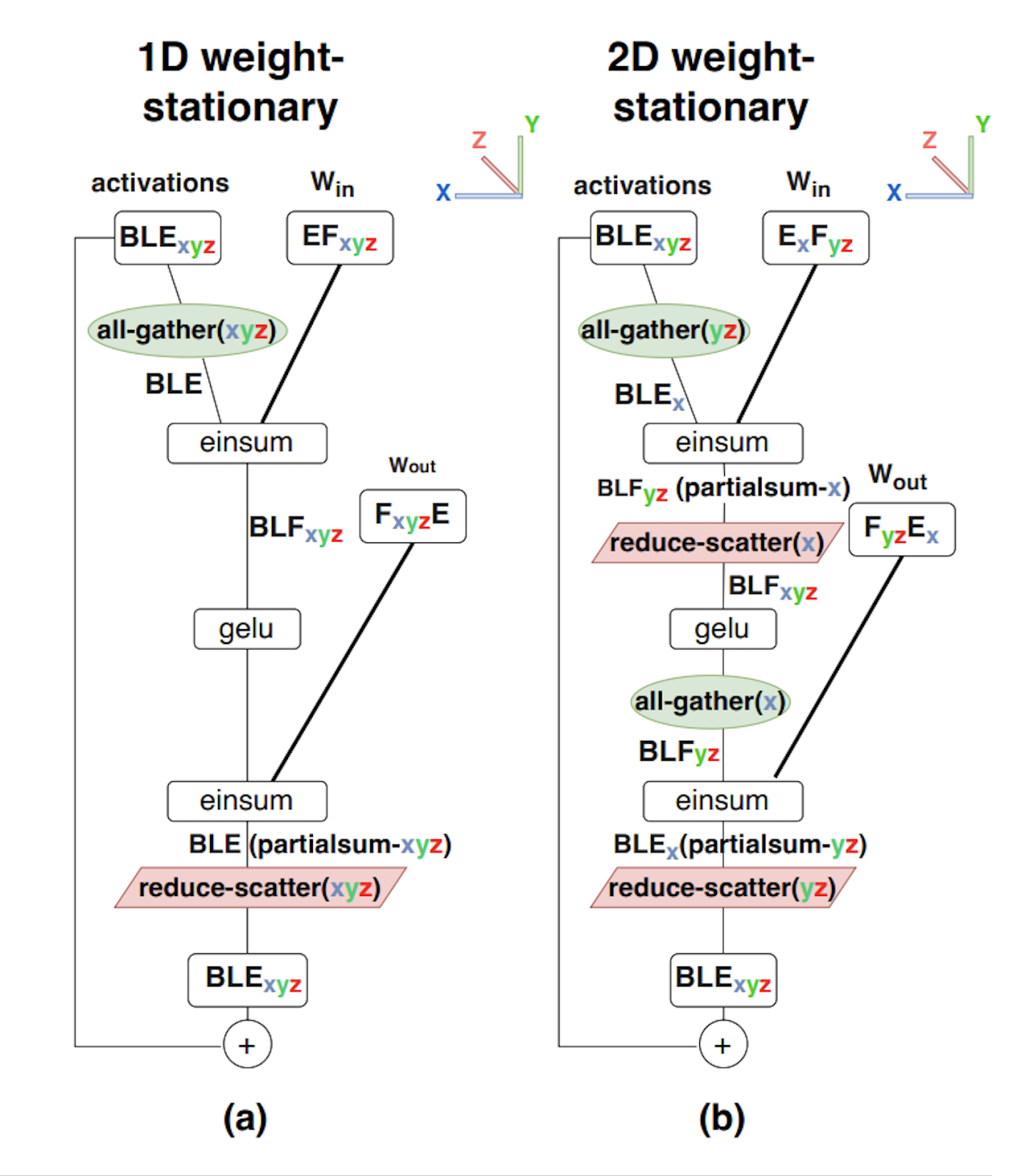- 2D 权重驻留分片:权重矩阵在隐藏层维度 和 reduction 维度 上同时进行分片,激活值则在 维度上分片。底层执行逻辑为:在第一层计算前先在 (yz) 轴执行 AllGather,计算完成后在 (x) 轴执行 ReduceScatter。