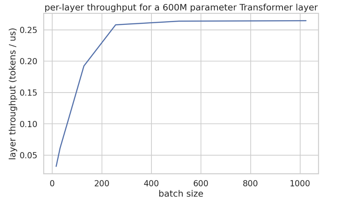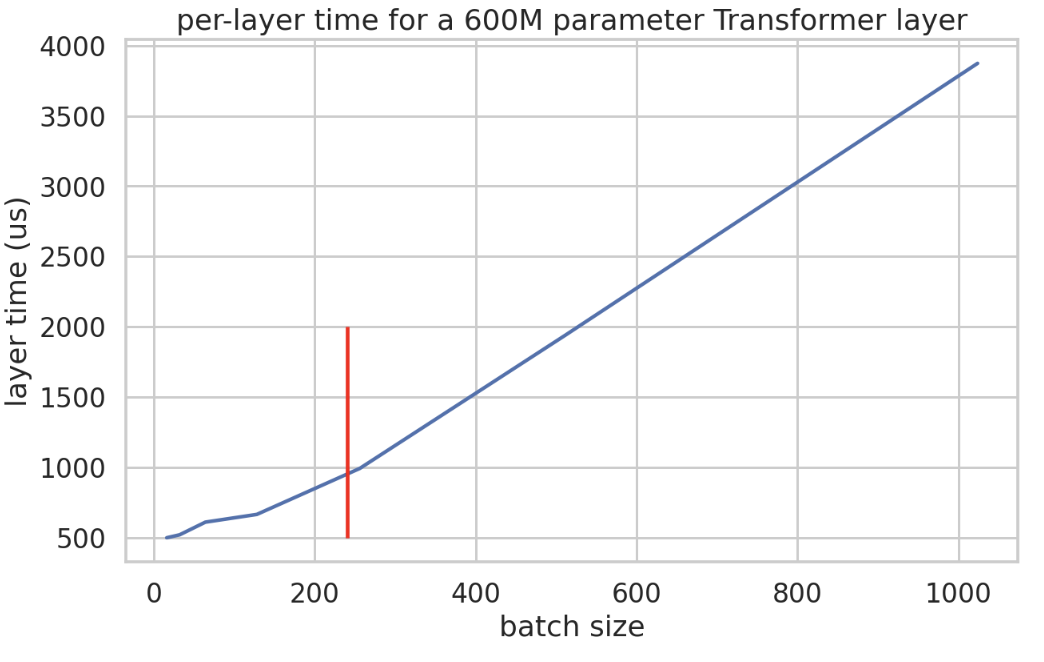 这和计算 Roofline 模型有相似之处:我们正在承担一些小型操作(通信延迟、矩阵乘内存带宽)的固定开销。