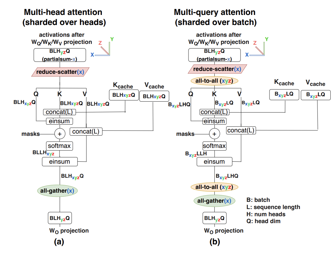 - 这里可能会有困惑,为什么可以从 head 和 kvcache 两个维度做联合分片,实现充分的芯片利用?首先 MHA 的各 head 在 、、 投影之前是完全独立的,head 维度是 attention 机制天然的并行轴,只要满足 head 数 ≥ TP 数就没问题,否则就要另行扩展,以充分利用芯片的并行能力;另外 KV Cache 的本质是一个逻辑张量 ,只要能够保证每个 Query token 再计算 attention 时能够看到所有历史 KV,那么 KV 存储在哪、如何切分,都只是工程实现的问题,而不构成语义、理论正确性上的问题。因此总的来说,这种联合分片的策略是一种在 Generation 阶段 时工程实现上的标准做法,是一个合法的 SPMD 变换。