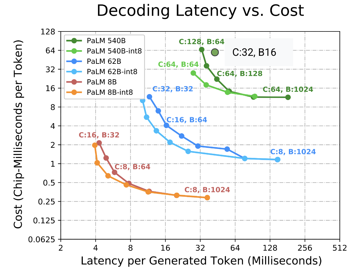 因此,当我们有超过 81 颗芯片时,我们使用 2D 权重驻留分片更优。这其实有一点奇怪,过去的经验告诉我们当我们触及 ICI 瓶颈时,模型并行度应该在 20 路左右。但是这里,即使我们受限于通信,总通信量却仍然随着芯片数量增加而减少!这意味着我们可以持续增加芯片数量,增加batch大小,进行更多参数缩放,并看到延迟降低。