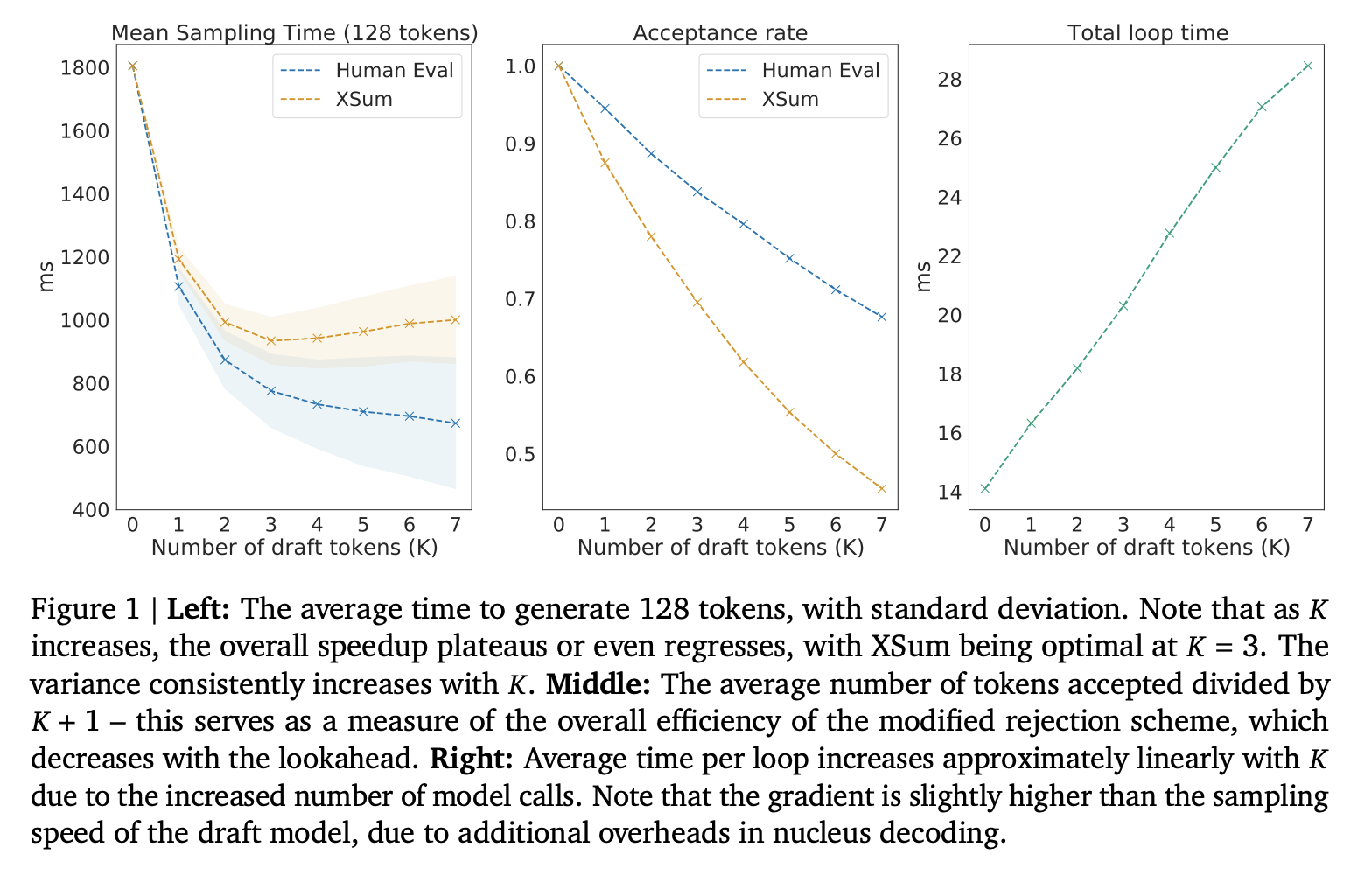 上图展示了 Chinchilla(一个来自 DeepMind 的 70B 模型)与一个 4B 参数的草稿模型(小模型)在每步耗时和投机成功率方面的表现。对于 XSum(一个自然语言数据集),理想的投机量约为 3-4 个 Token;而 HumanEval(一个编程数据集)则更可预测,更激进的投机策略也能带来收益。