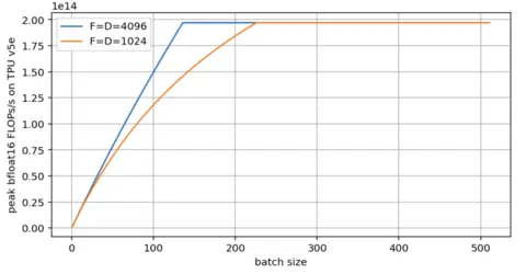 代表了加速器达到峰值性能所需的最低算术强度。以 TPU v5e 的矩阵乘法单元 (MXU2) 为例,其算术强度阈值约为 240 FLOPs/byte(基于其 FLOPs/s 的峰值算力和 Bytes/s 的 HBM 带宽得出)。如果算法的算术强度低于 240 FLOPs/byte,其瓶颈将锁定在访存带宽上,导致硬件算力无法被充分挖掘。
