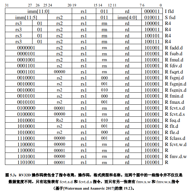使用两组寄存器对 RISC-V 指令集的主要影响是,必须要添加新的指令来加载和存储数据 f 寄存器,还需要添加新指令用于在 x 和 f 寄存器之间传递数据。图 5.4 列出了 RV32D 和 RV32F 寄存器及对应的由 RISC-V ABI 确定的寄存器名称。