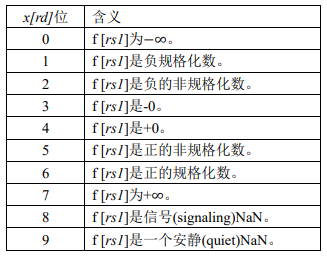 classify 分类指令(fclass.s,fclass.d)对数学库也很有帮助。他们测试一个源操作数来看源操作数满足下列 10 个浮点数属性中的哪些属性 (参见下表),然后将测试结果的掩码写入目的整数寄存器的低 10 位。十位中仅有一位被设 置为 1,其余为都设置为 0。