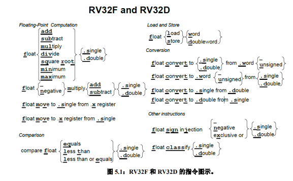 尽管 RV32F 和 RV32D 是分开的,单独的可选指令集扩展,他们通常是包括在一起的。 为简洁起见,我们在一章中介绍了几乎所有的单精度和双精度(32 位和 64 位)浮点指令。 图 5.1 是一个 RV32F 和 RV32D 扩展指令集的图形表示。图 5.2 列出 RV32F 的操作码,图 5.3 列出了 RV32D 的操作码。和几乎所有其他现代 ISA 一样,RISC-V 服从 IEEE 754-2008 浮点标准。
