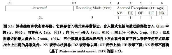 IEEE 754-2008 标准提供了几种浮点运算舍入的方法,这有助于确定误差范围和编写数值库。最准确且最常见的舍入模式是舍入到最近的偶数(RNE)。舍入模式可以通过浮点控制和状态寄存器 fcsr 进行设置。图 5.5 显示了 fcsr 并列出了舍入选项。它还包含标准所需的累积异常标志。