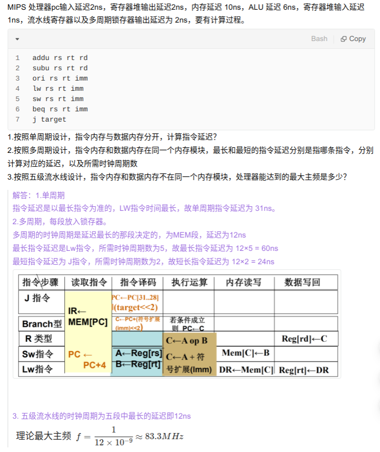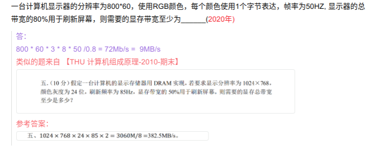 流水线 计算主频 吞吐率 1/每段的时间 流水线冲突处理 控制冲突 分支预测 存储器 带宽计算 刷新带宽计算公式 刷新带宽 = 分辨率*像素点颜色的深度(单位是 B)*刷新频率 总带宽() = 刷新带宽 / 刷新带宽所占比例 提高刷新带宽存储的方法 使用高速 DRAM 芯片 采用双端口存储器,将刷新端口和更新端口分开 Cache 计算 cache 缺失率的经验公式