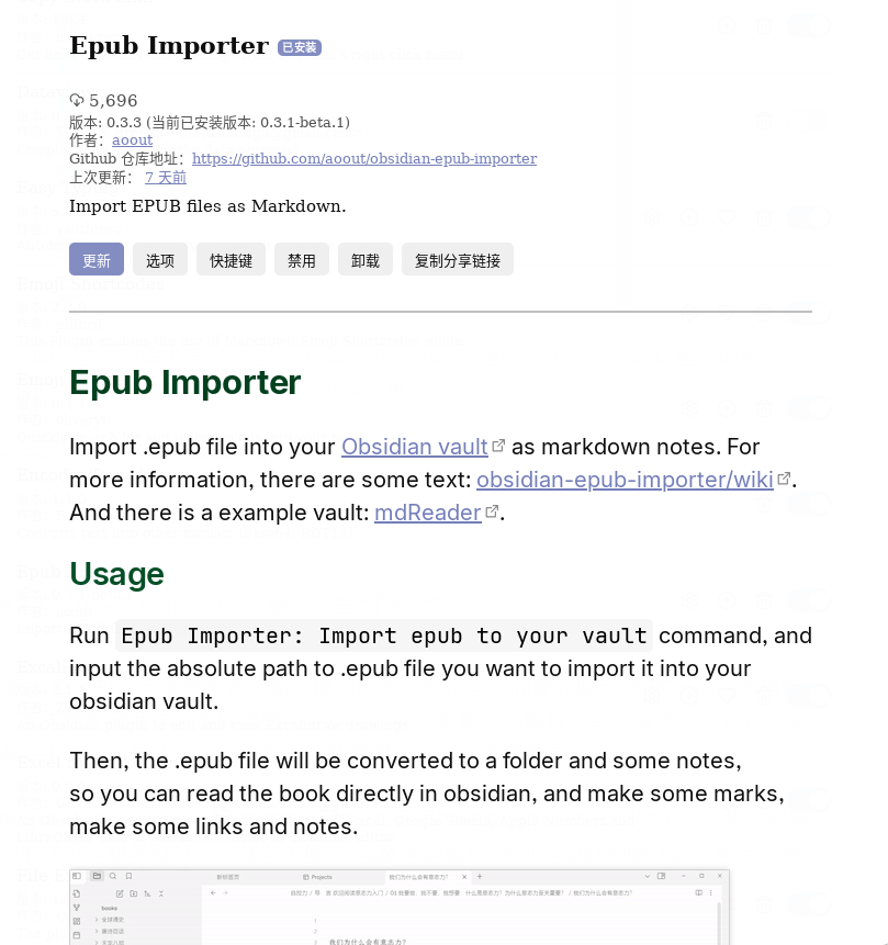关于电子书,Obsidian 插件仓库中有一个名为 epub-importer 的插件,可以将 Epub 格式的电子书一键导入到 Obsidian 库中,并且编纂好索引,这非常方便。另外 Epub 格式的电子书可以在 Zlibrary 等网站收集。