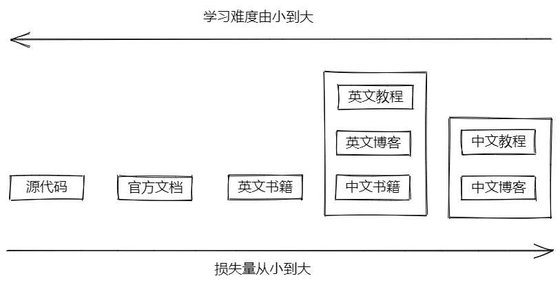 于是我就顺其自然地开始翻阅英文书籍。不得不说,英文书籍内容的质量整体是比中文书籍高的。后来随着学习的层层深入,以知识的时效性和完整性出发,我得出了一张 信息损失图:
