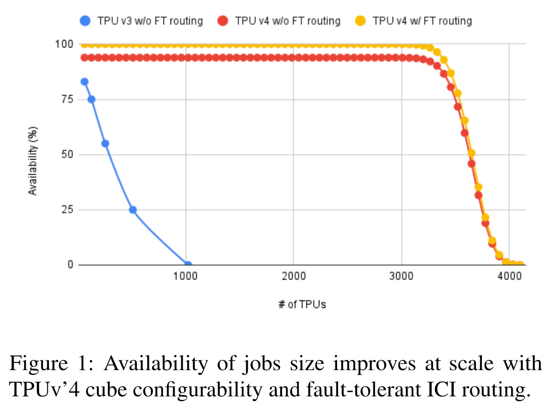 相较于前代 TPUv3 的静态架构,TPUv4 的 OCS 重构能力显著提升了系统可用性(如 1024 节点时可用性从 TPUv3 的快速下降改善了 94%,在大概 50 cube 或 3200 TPUv4 时才会下降),同时通过容错路由进一步优化至 99.98%。