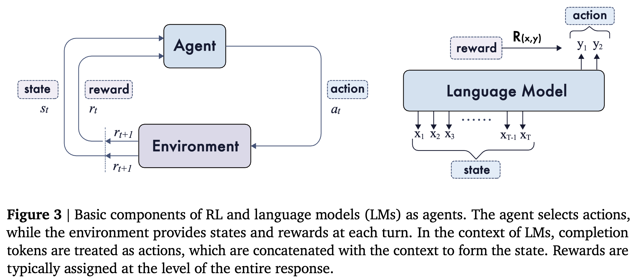 Sun 等人[2025b]对基于基础模型的推理提出了更宏观的结构化见解,重点介绍了专门为推理提出或适配的基础模型,以及在多样化推理任务、方法论和基准测试方面的最新进展。Zhang 等人[2025b]研究了如何通过强化学习赋予大语言模型自主决策与自适应智能体能力。Xu 等人[2025a]的研究与我们的关注点更为接近,通过讨论大语言模型的强化推理,着重阐释了试错优化机制如何提升复杂推理能力。Wu[2025]则通过综述奖励模型与反馈学习策略对此视角进行了补充。然而,这些研究仍以推理性能或奖励设计为导向,未能系统性地整体探讨适用于大语言模型的强化学习方法。