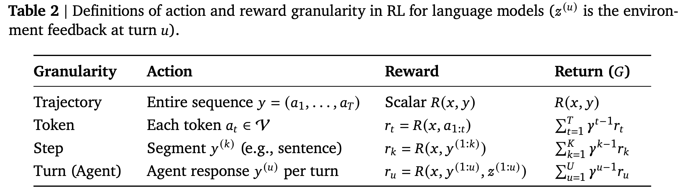 • 奖励 ( or ):通常在整个序列生成结束后(即模型输出完整答案后)给出。对于可验证任务,这个奖励可以是一个标量值,比如答案正确奖励为 +1,错误为 0 。并且根据动作的粒度分配奖励函数:例如在轨迹末端使用 seq-level 奖励 、每生成一个 token 使用 token-level 奖励 、或每生成一个片段使用 step-level 奖励 )。
